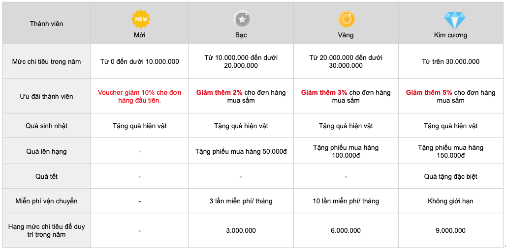 - Hạng thành viên sẽ được cập nhật lại vào ngày cuối cùng của tháng 12. Trường hợp không đủ hạn mức duy trì hạng sẽ bị hạ 1 hạng thành viên.